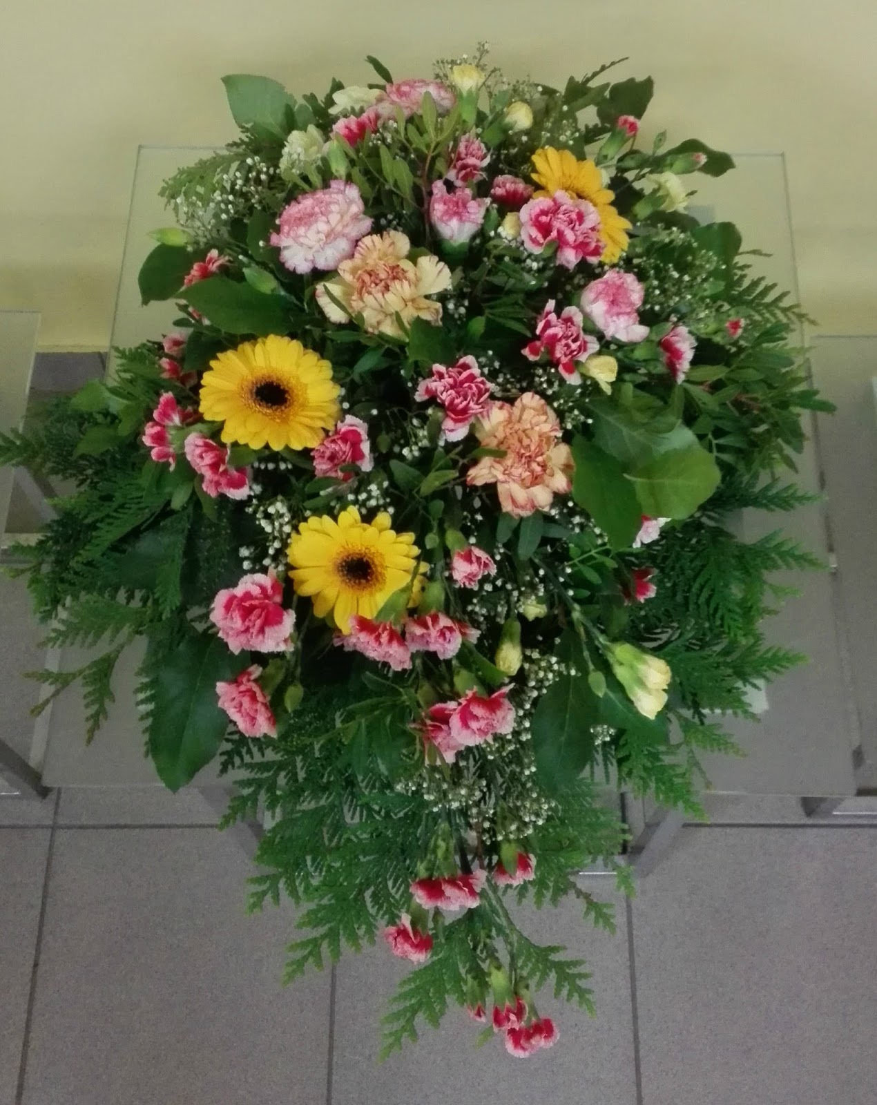Järgmises tunnis saime uue ülesande, mis tundus esmapilgul kergem, kuid teostus osutus siiski üpris keerukaks. Nimelt pidime tegema tilgakujulise matusekimbu. Minu oma tuli üsna lopergune, ning ka värvuslahendus oli väga närviline. Aga võin ikkagi öelda, et jäin tulemusega pigem rahule, sest tehnilise poole pealt oli asi ikkagi korras ja kui õppejõud mu kimpu läbi raputas (seda teeb ta alati), kukkus ainult 2 õit välja :D